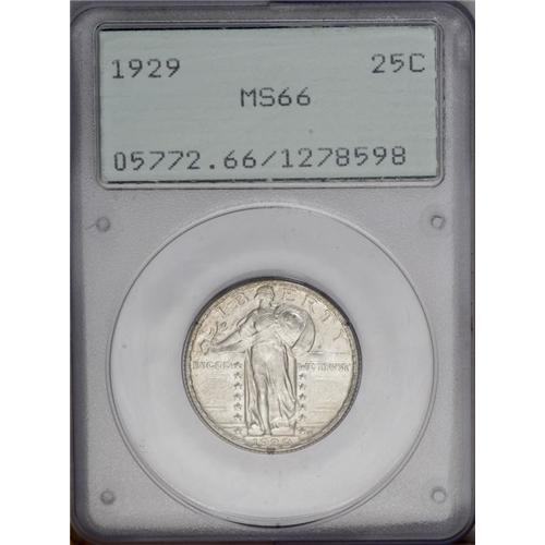 <B>1929 25C MS66 PCGS.</B></I> Delicate steel-blue and chestnut colors drape this lustrous and undisturbed premium Gem. The strike is good, if not quite sufficient for a Full Head designation. Housed in a first generation capsule.