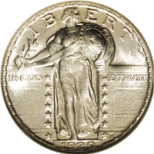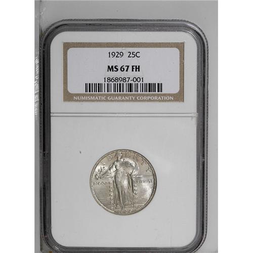 <B>1929<25C> MS67 Full Head NGC.</B></I> Delicate powder-blue and apricot toning drapes this beautiful Superb Gem. The nearly unabraded fields and devices are awash in bright luster. A couple of shield rivets near the waist lack absolute detail, but this is an overall crisp example of the often strike-challenged type. 1929 witnessed the stock market crash that led to the Great Depression, but a few collectors managed to salt away mint rolls, and held them despite the difficult years that followed. Most pieces from these few rolls grade MS63 to MS65. Premium Gems are scarce, and Superb Gems are decidedly rare. Census: 9 in 67, 0 finer (7/06).