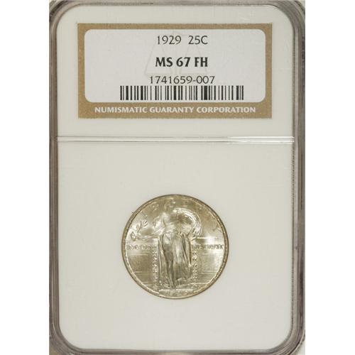 <B>1929 25C MS67 Full Head NGC.</B></I> The Standing Liberty quarter is known for strong eye appeal when found in high grades. This piece takes that concept to another level. Mostly brilliant, the surfaces exude a shimmering, satin-like mint luster and are virtually unaffected by post-striking impairments. Exceptional quality and well worth the premium this coin will surely bring. Census: 9 in 67 Full Head, 0 finer (4/07).<BR><BR><b>Shipping:</b> Coins & Currency (<a target="_blank" href="http://www.heritageauctions.com/common/shipping.php">view shipping information</a>)