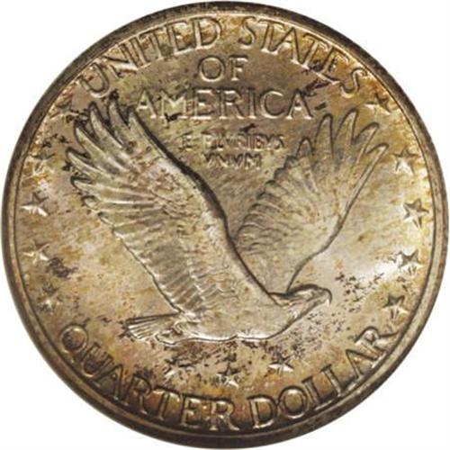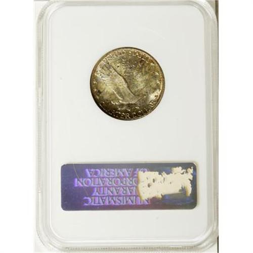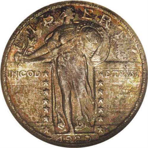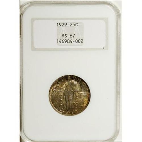 <B>1929 25C MS67 NGC.</B></I> Splashes of apple-green and orange overlie the lustrous pearl-gray surfaces. Remarkably void of contact, and the eye appeal is also exemplary. The strike is good, with the expected slight softness on the center of Liberty's head and on the two shield rivets near Liberty's waist. Housed in an earlier generation NGC holder. Census: 2 in 67, 0 finer (8/07).<BR><BR><B>Coin Engraver:</B> Hermon A. MacNeil<BR><BR><b>Shipping:</b> Coins & Currency (<a target="_blank" href="http://www.heritageauctions.com/common/shipping.php">view shipping information</a>)
