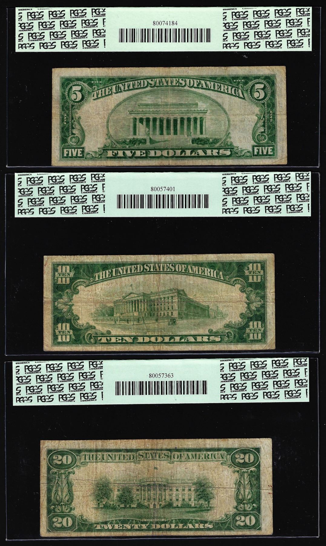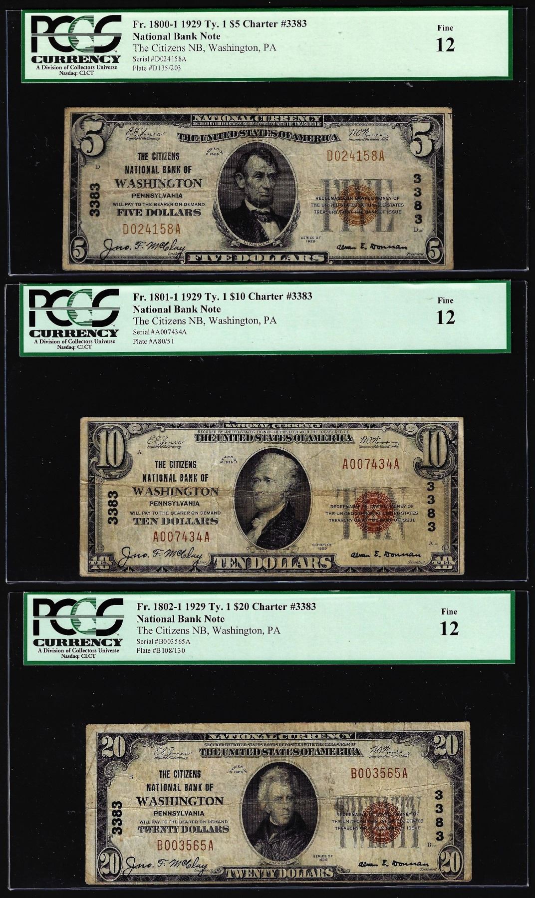 One 1929 $5/10/20 Citizens NB Washington, PA CH# 3383 National Currency Notes PCGS F12.