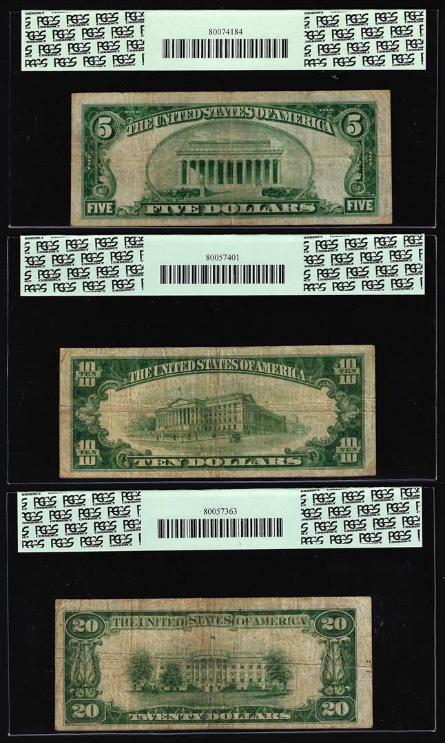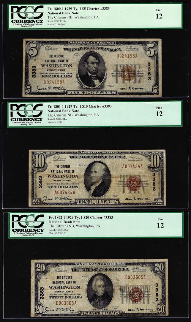 One 1929 $5/10/20 Citizens NB Washington, PA CH# 3383 National Currency Notes PCGS F12. PCGS Graded.