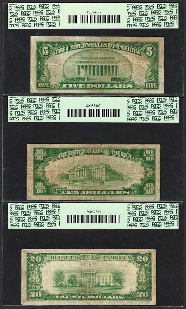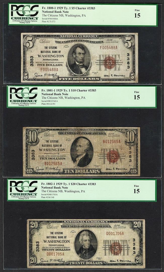 One 1929 $5/10/20 Citizens NB Washington, PA CH# 3383 National Currency Notes PCGS F15. PCGS Graded.