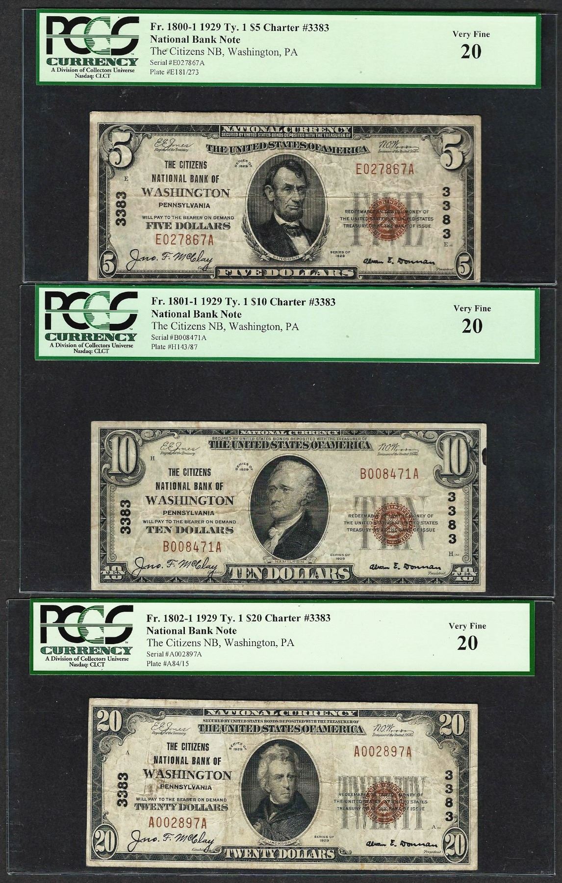 1929 $5/10/20 Citizens NB Washington, PA CH# 3383 National Currency Notes PCGS VF20