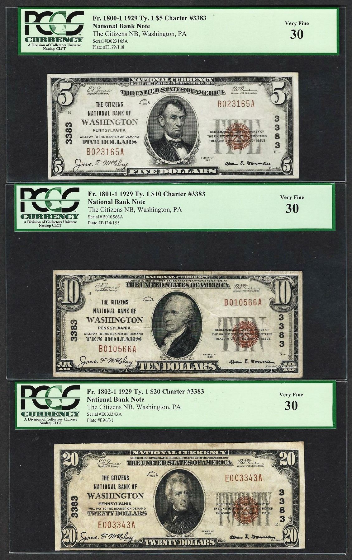 1929 $5/10/20 Citizens NB Washington, PA CH# 3383 National Currency Notes PCGS VF30