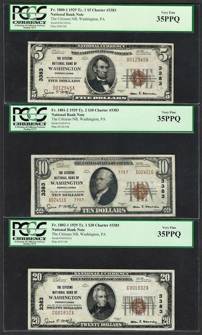 One 1929 $5/10/20 Citizens NB Washington, PA CH# 3383 National Currency Notes PCGS VF35PPQ. PCGS Graded.