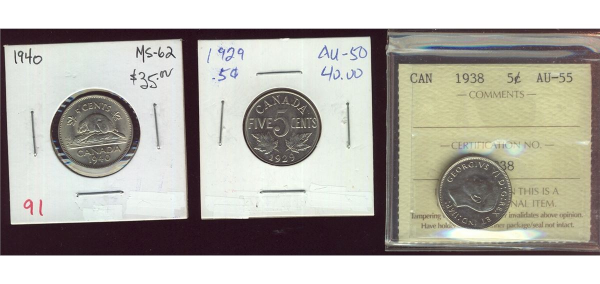 1929 5¢, 1938 & 1940. Lot of 3 coins AU to UNC. 1938 ICCS AU55.