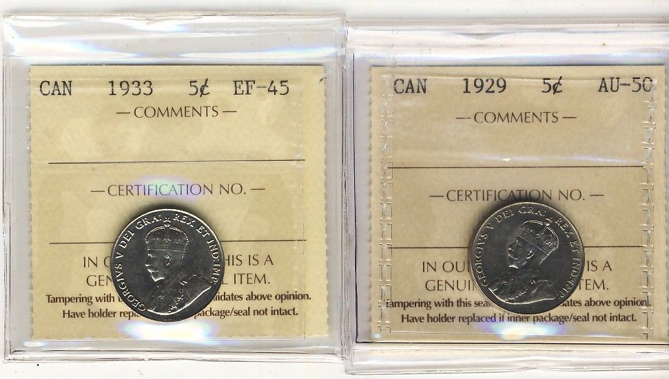 1929 5¢ AU & 1933 EF45. Lot of 2 ICCS coins.