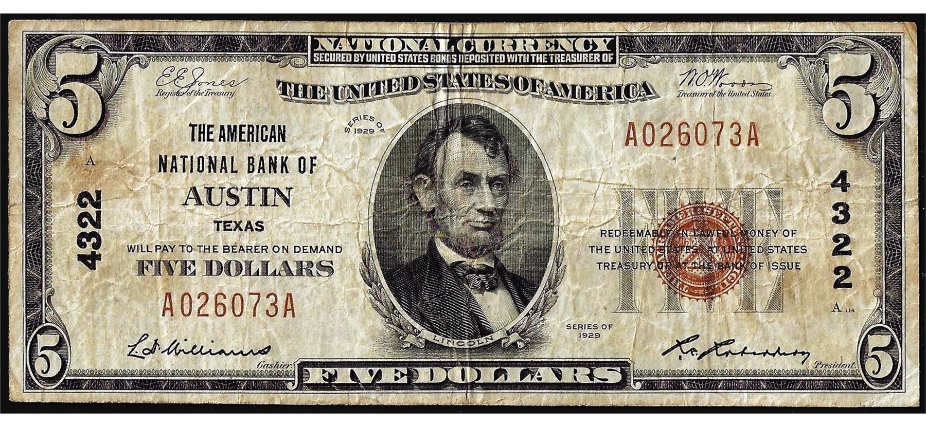 One 1929 $5 American National Bank of Austin, Texas CH# 4322 National Currency Note.
