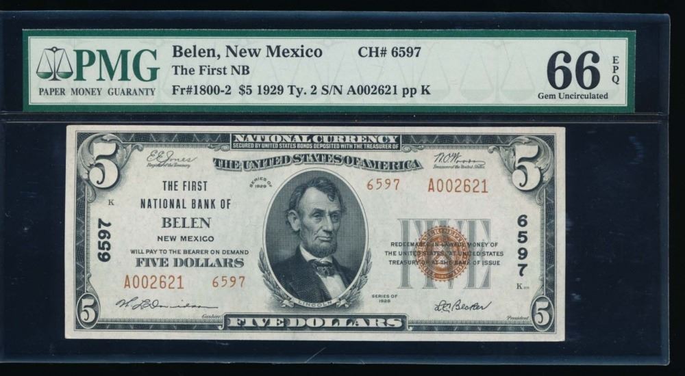 One 1929 $5 Belen National Bank Note PMG 66EPQ.
