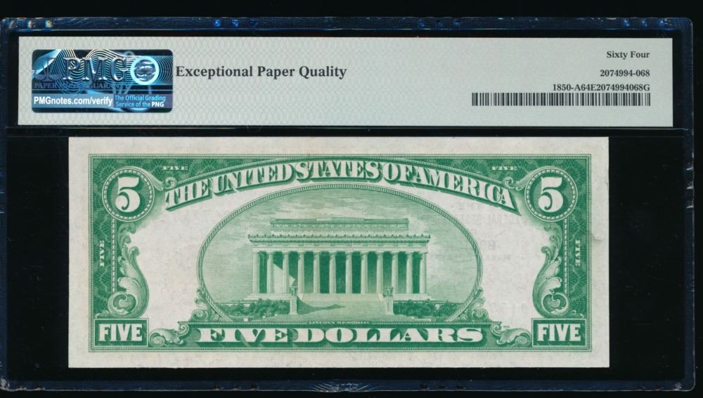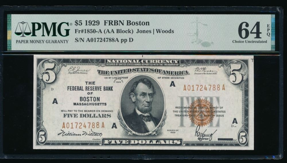 One 1929 $5 Boston FRBN PMG 64EPQ.