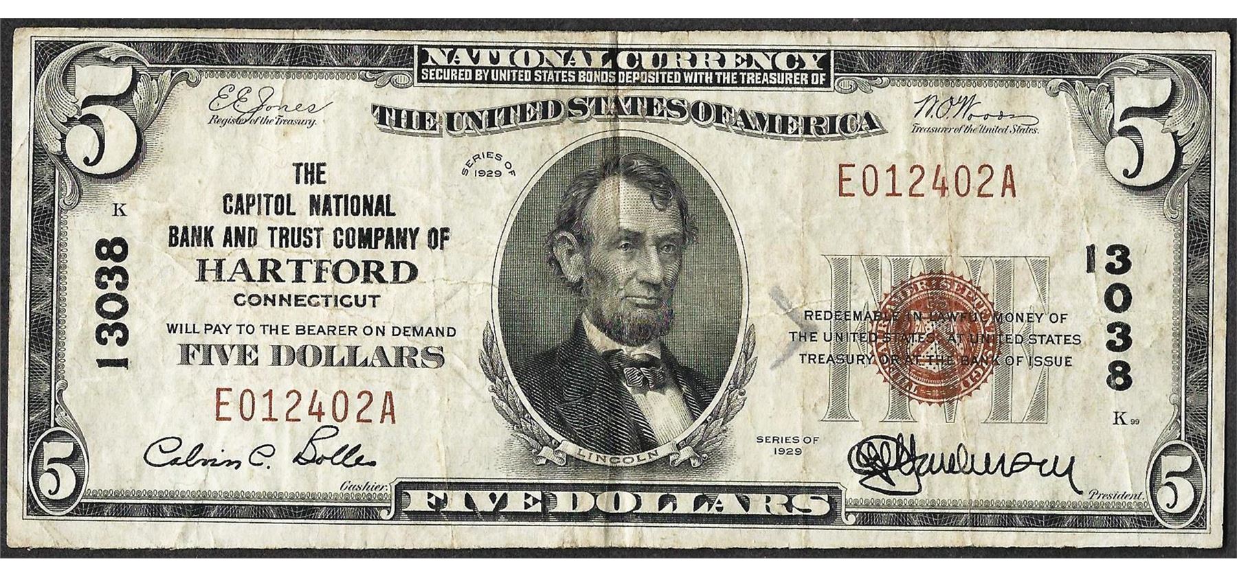 One 1929 $5 Capitol National Bank Hartford, CT CH#13038 National Currency Note.