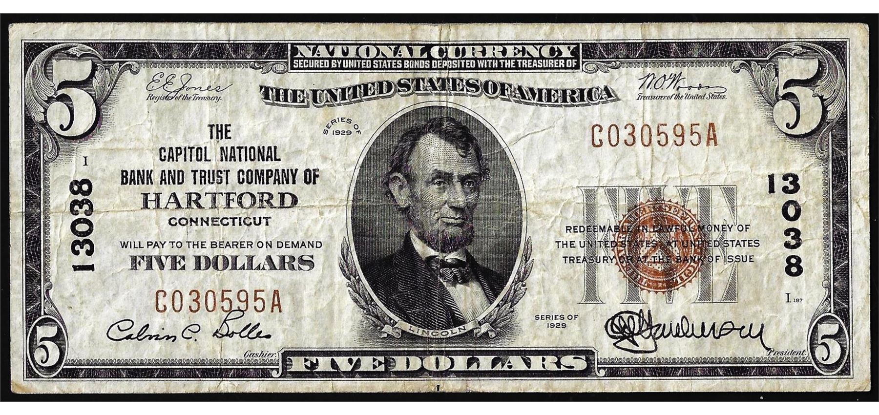 1929 $5 Capitol National Bank & Trust Hartford, CT CH# 13038 National Currency Note