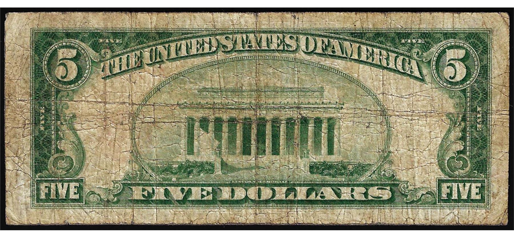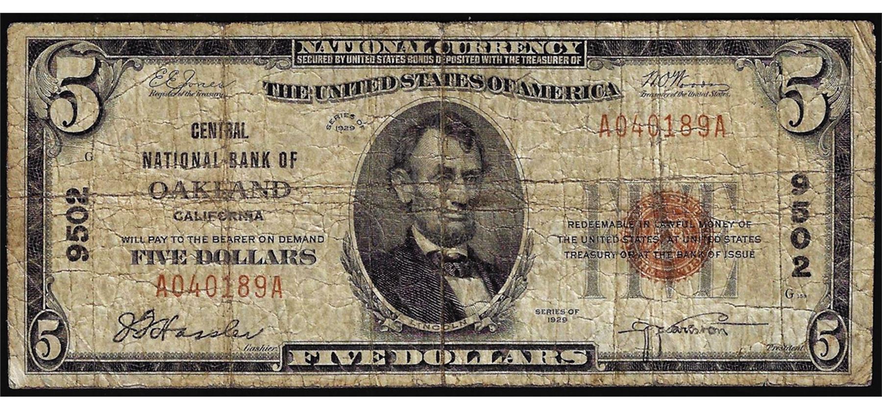 One 1929 $5 Central National Bank of Oakland, CA CH# 9502 National Currency Note.