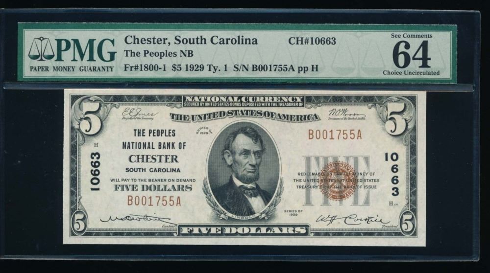 One 1929 $5 Chester National Bank Note PMG 64EPQ.
