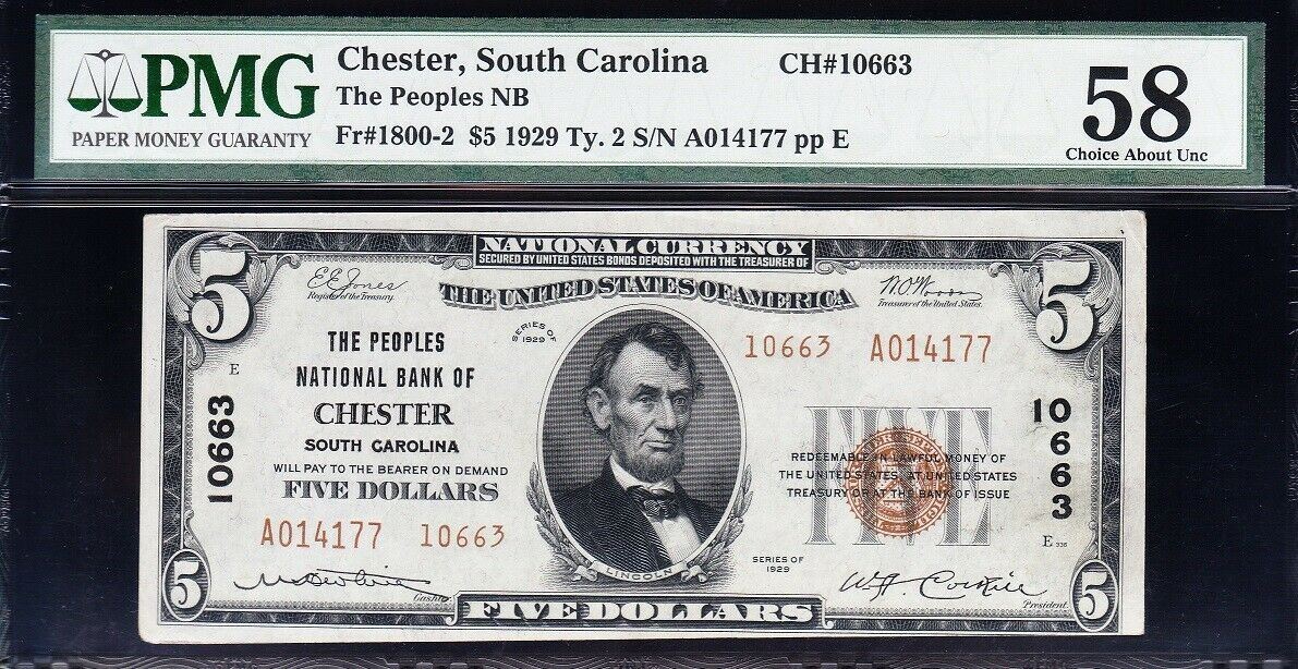 One 1929 $5 Chester SC National PMG 58.