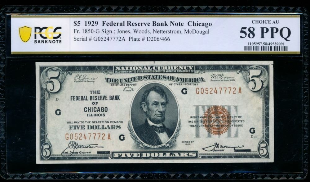 One 1929 $5 Chicago FRBN PCGS 58PPQ.
