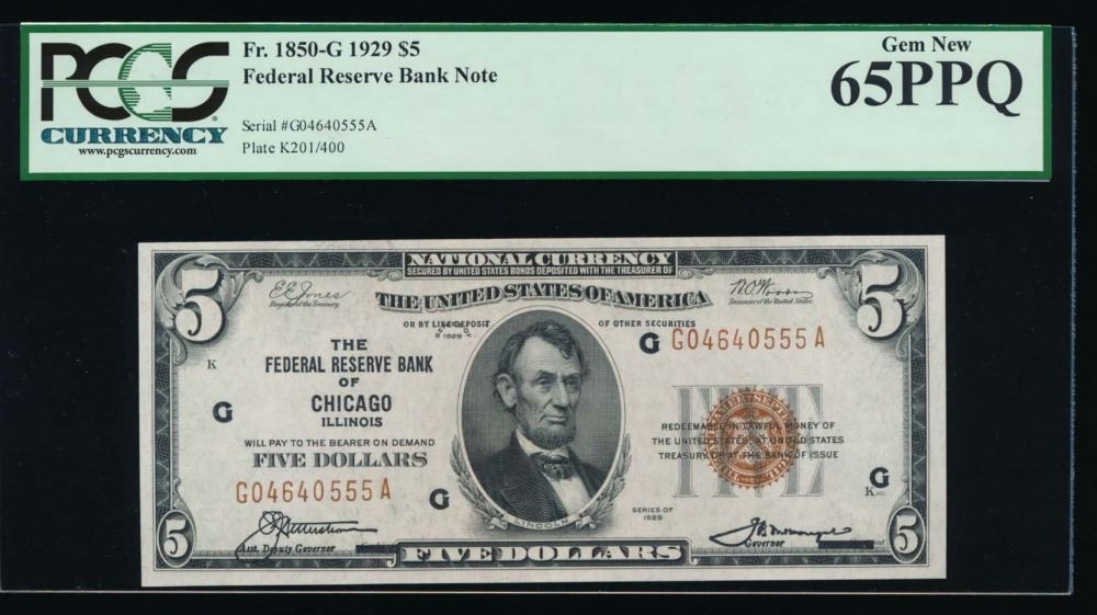 One 1929 $5 Chicago Federal Reserve Bank Note PCGS 65PPQ.