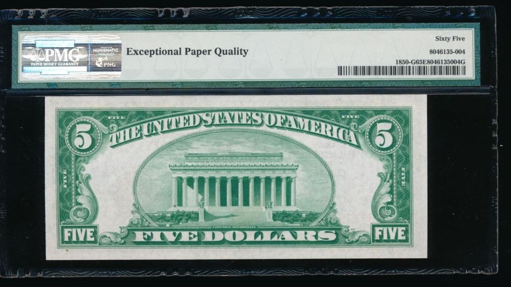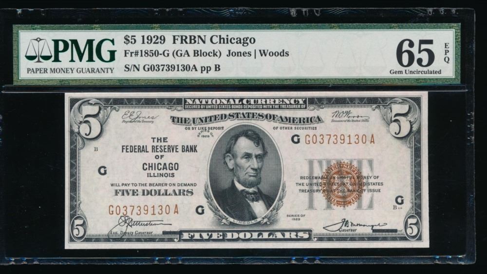 One 1929 $5 Chicago Federal Reserve Bank Note PMG 65EPQ.