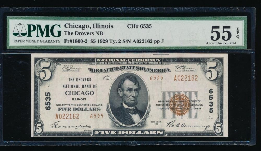 One 1929 $5 Chicago National Bank Note PMG 55EPQ.