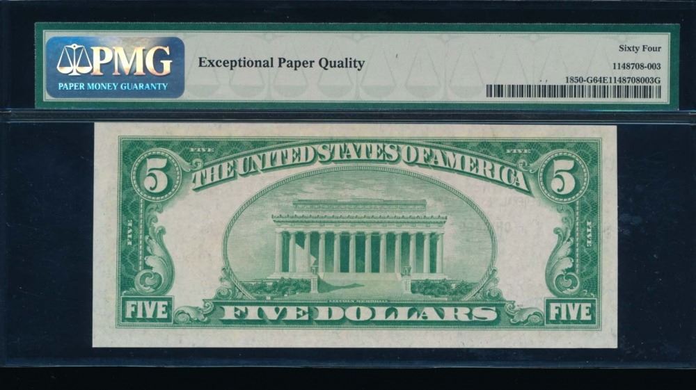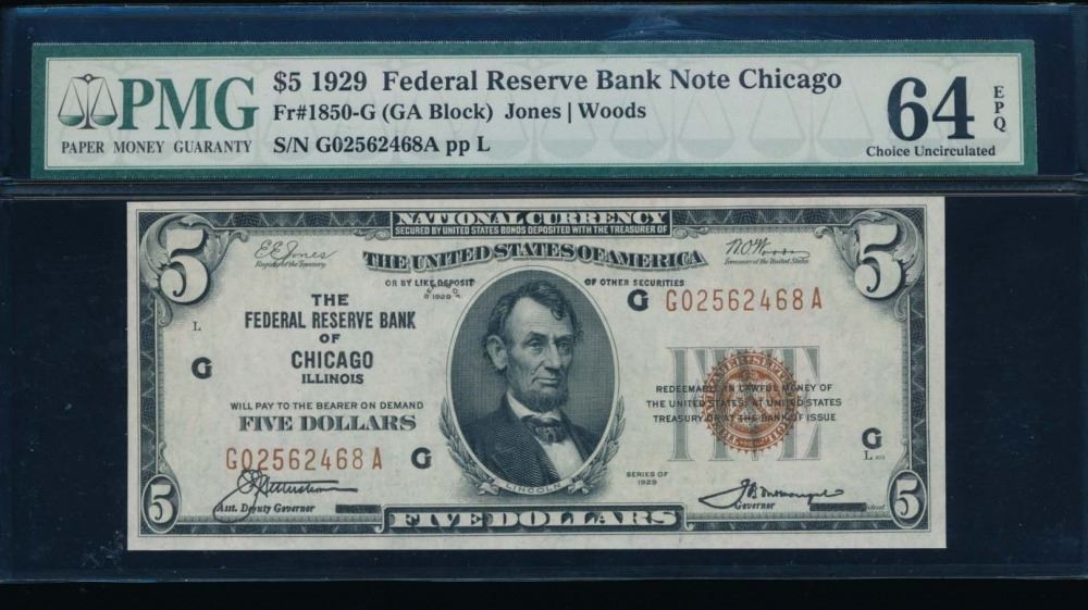 One 1929 $5 Chicago National Bank Note PMG 64EPQ.