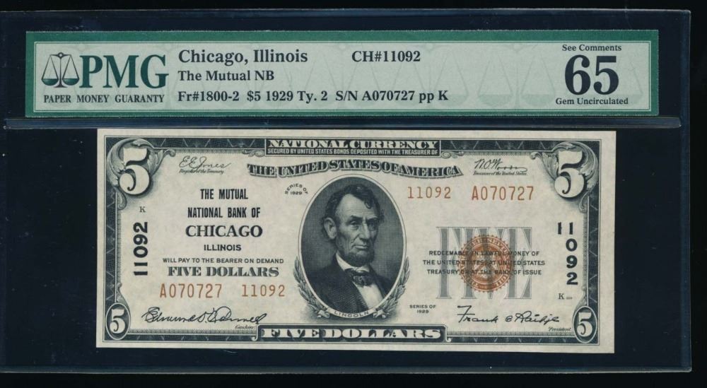 One 1929 $5 Chicago National Bank Note PMG 65.