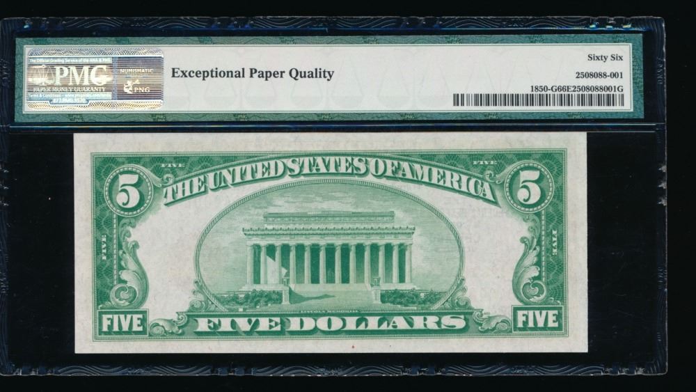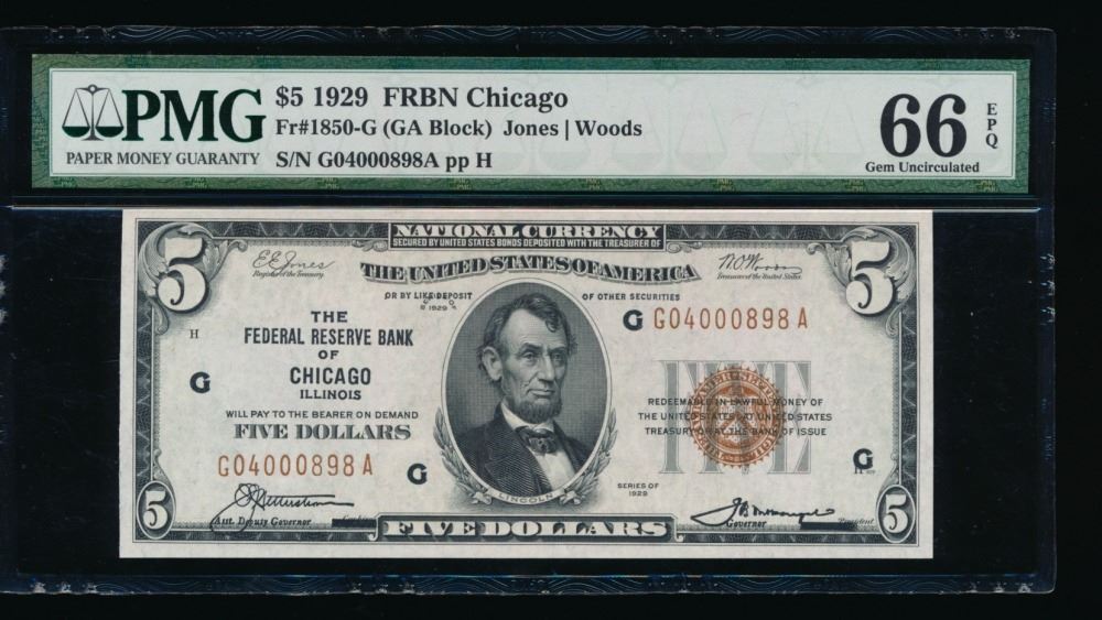 One 1929 $5 Chicago National Bank Note PMG 66EPQ.