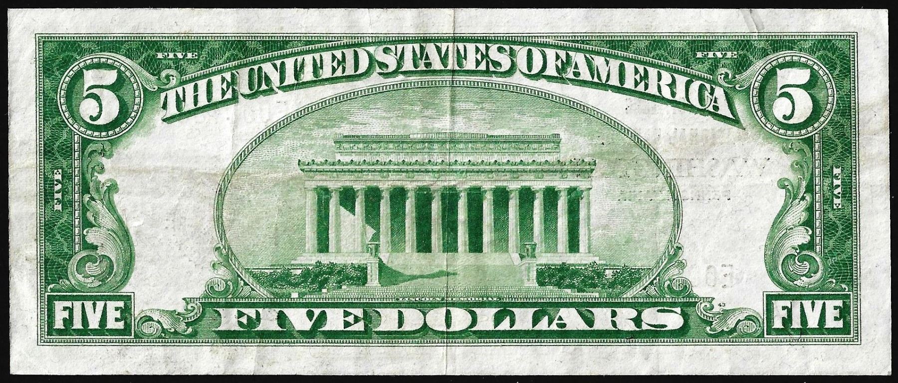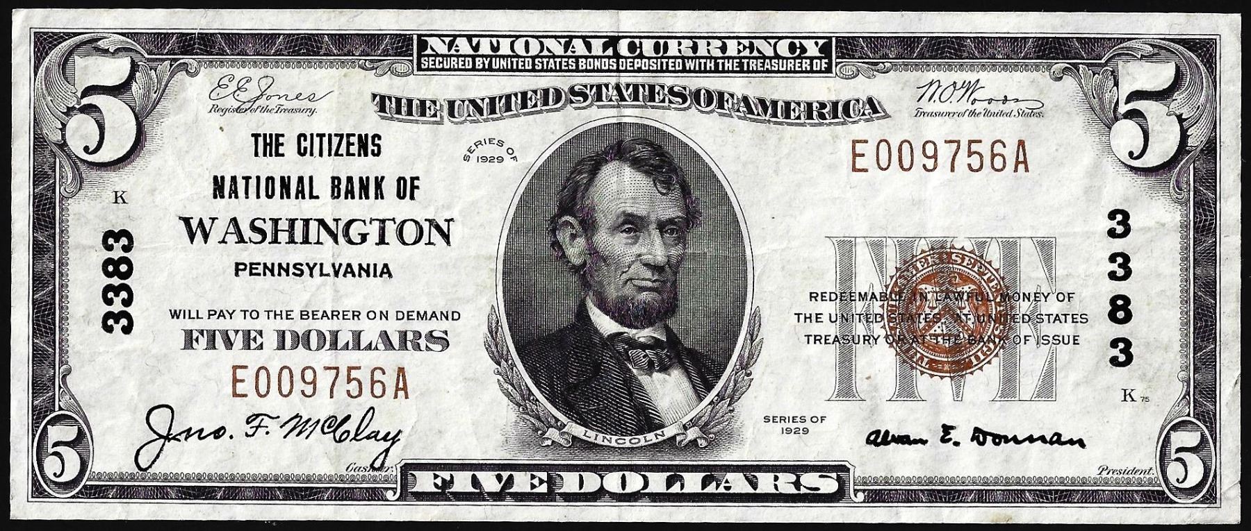 One 1929 $5 Citizens NB of Washington, Pennsylvania CH# 3383 National Currency Note.