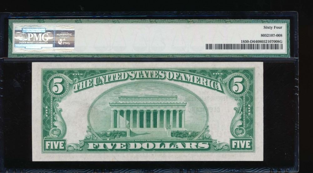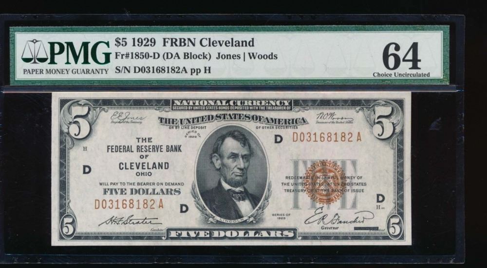 One 1929 $5 Cleveland Federal Reserve Bank Note PMG 64.