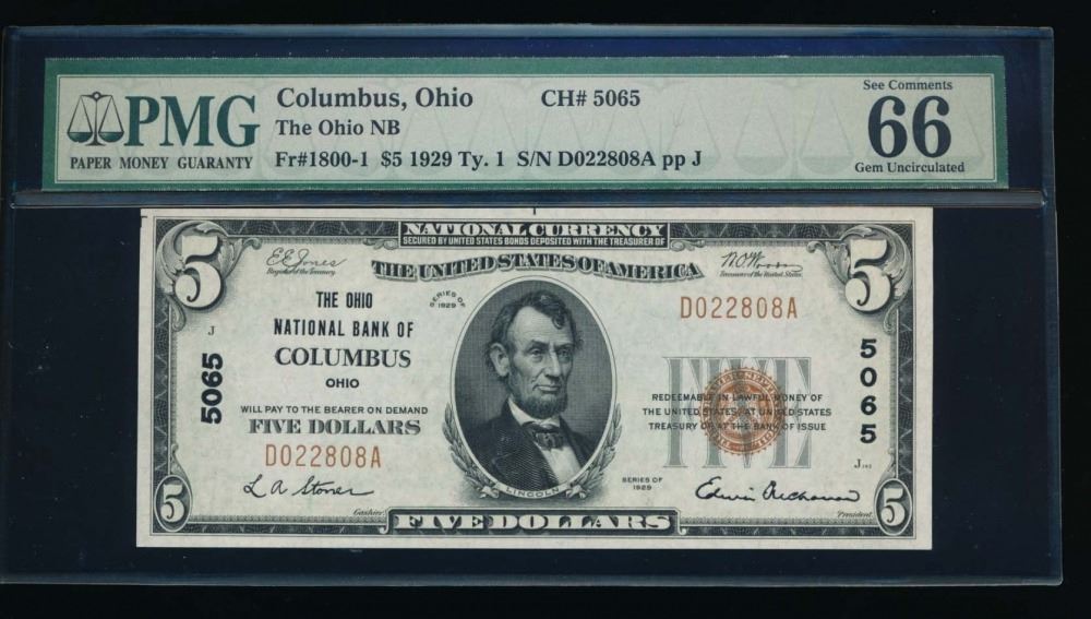 One 1929 $5 Columbus National Bank Note PMG 66EPQ.