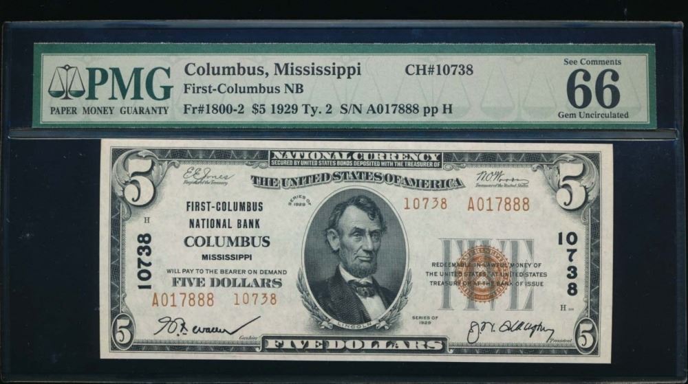 One 1929 $5 Columbus National Bank Note PMG 66EPQ.