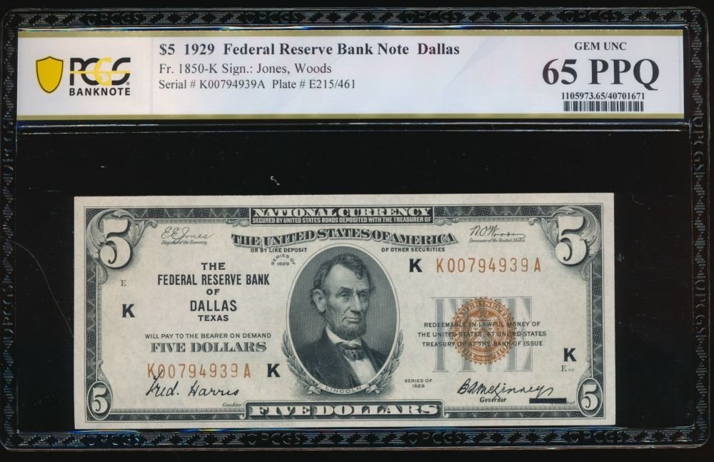 One 1929 $5 Dallas FRBN PCGS 65PPQ.