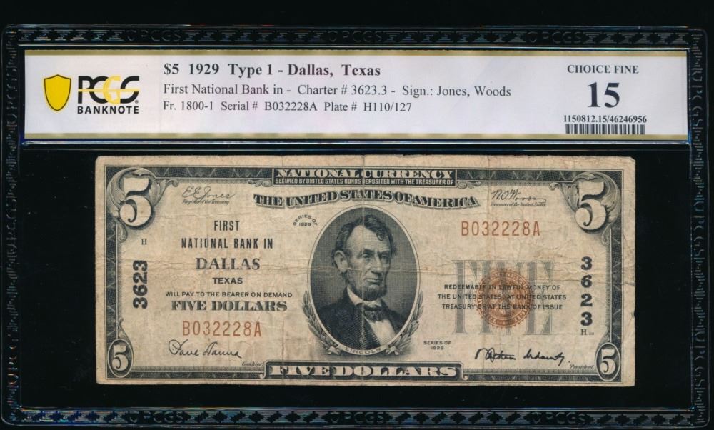 One 1929 $5 Dallas TX National PCGS 15.