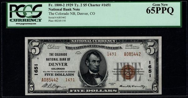 One 1929 $5 Denver CO National Bank Note PCGS 65PPQ.