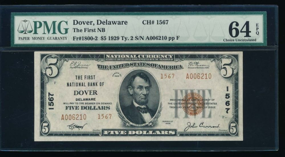 One 1929 $5 Dover National Bank Note PMG 64EPQ.