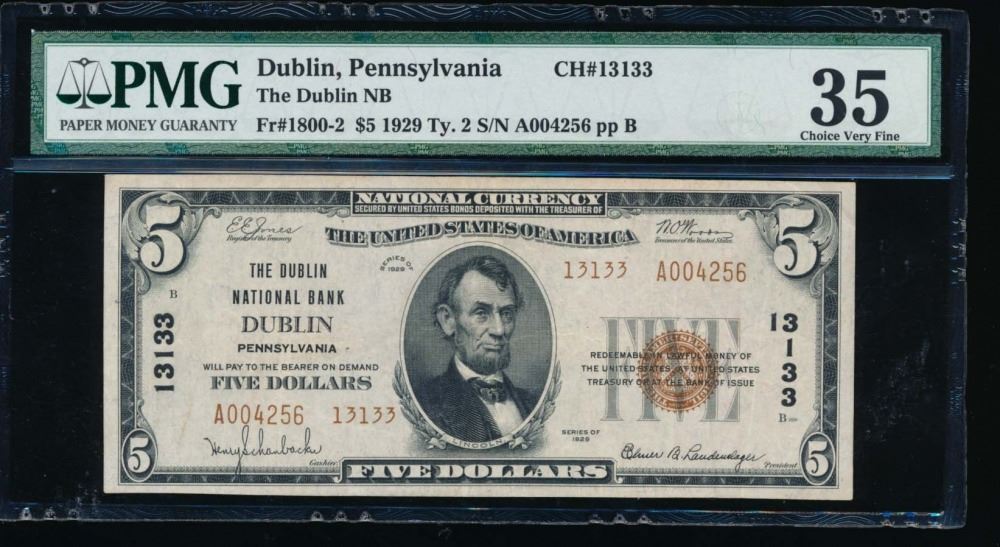One 1929 $5 Dublin National Bank Note PMG 35.