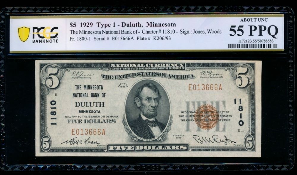 One 1929 $5 Duluth MN National PCGS 55PPQ.