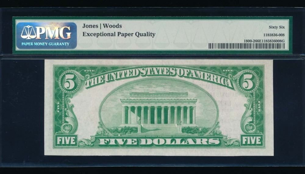 One 1929 $5 Elkins National Bank Note PMG 66EPQ.