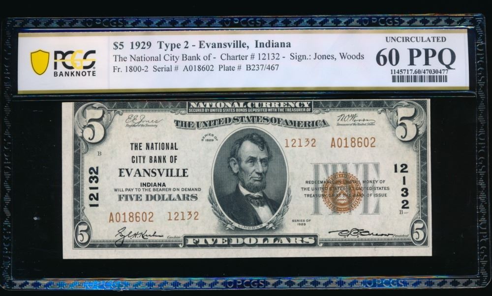 One 1929 $5 Evansville IN National PCGS 60PPQ.
