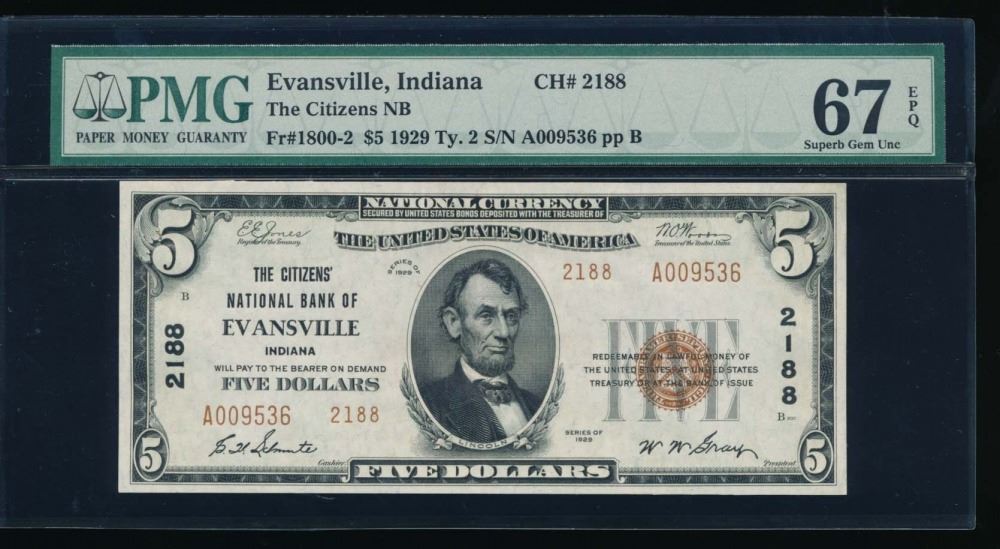One 1929 $5 Evansville National Bank Note PMG 67EPQ.