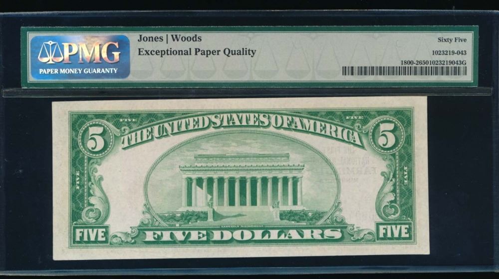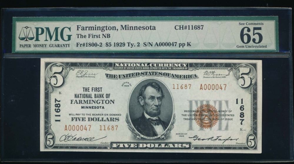 One 1929 $5 Farmington National Bank Note PMG 65EPQ.