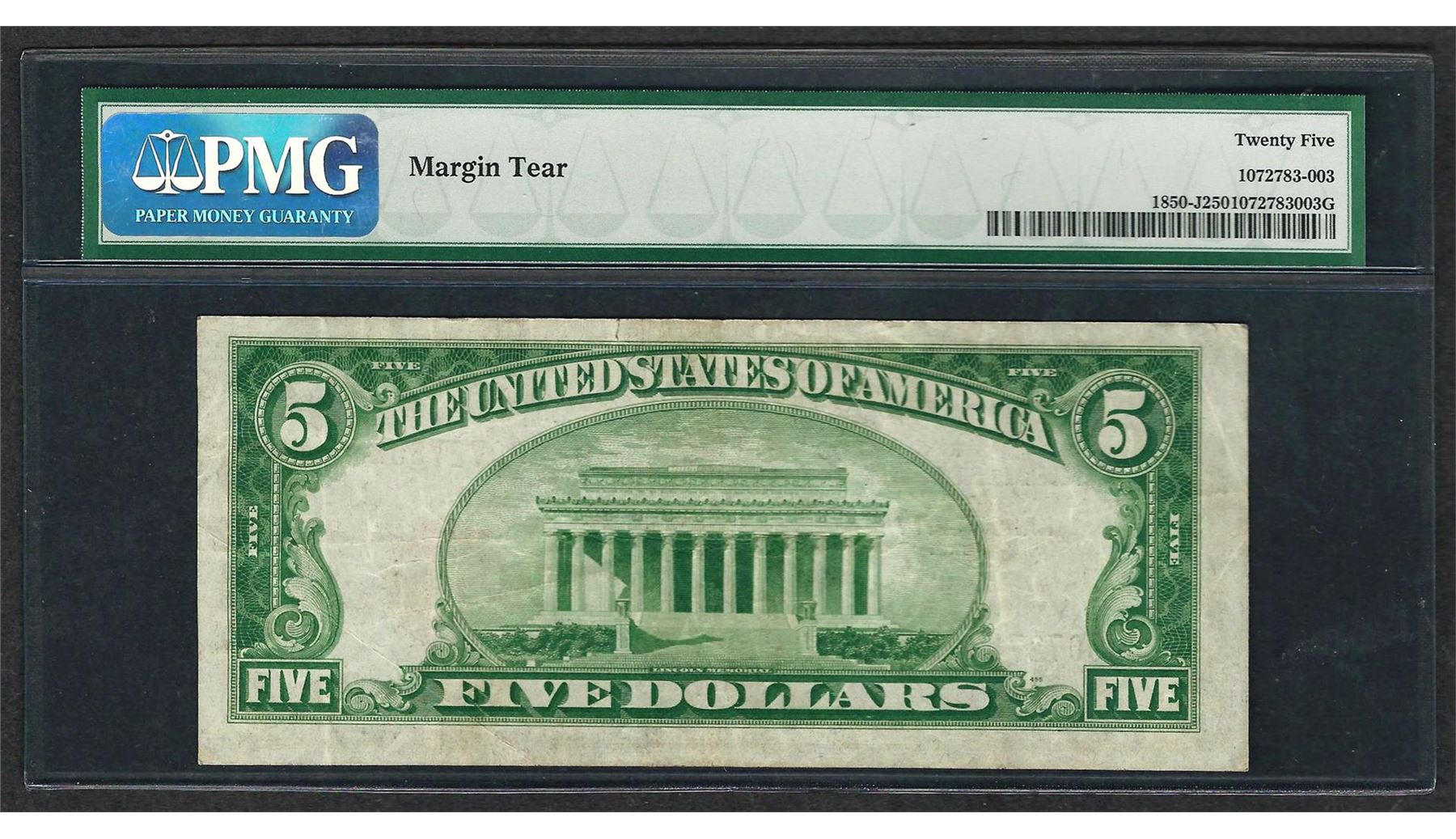 One 1929 $5 Federal Bank of Kansas City Note Fr.1850-J PMG Very Fine 25. PMG Certified.
