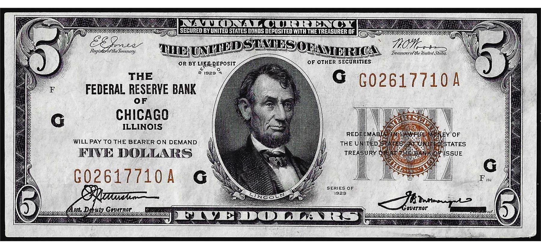 One 1929 $5 Federal Reserve Bank Note Chicago.