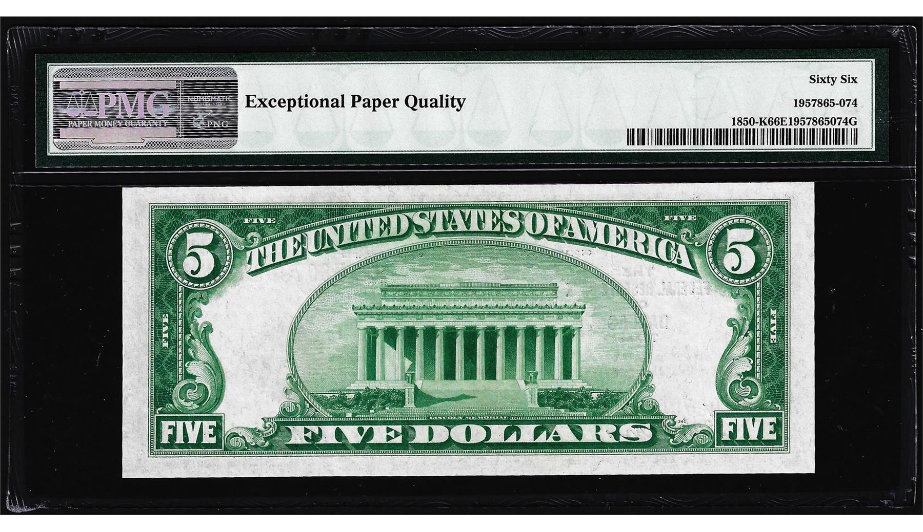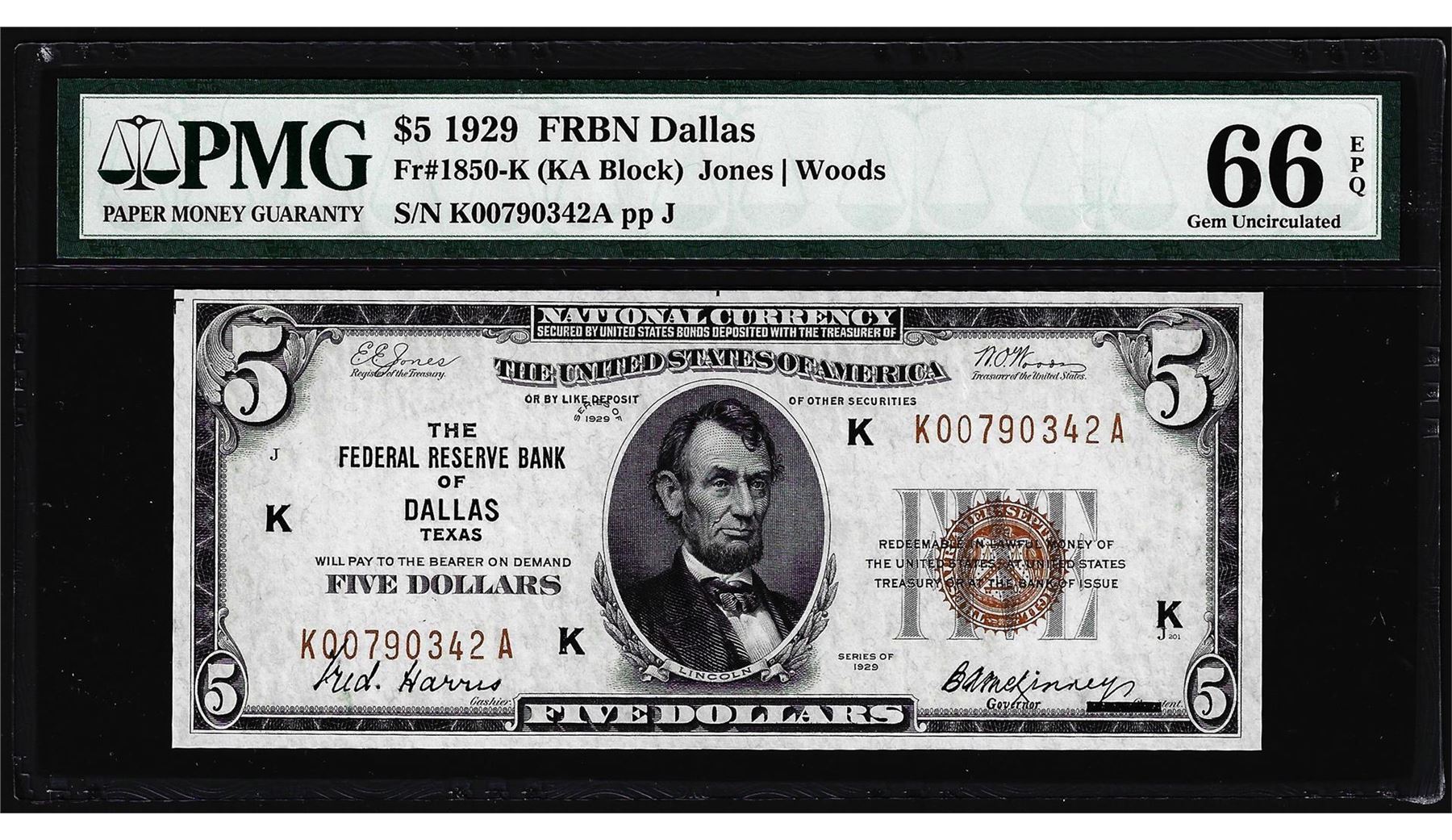 One 1929 $5 Federal Reserve Bank Note Dallas Fr.1850-K PMG Gem Uncirculated 66EPQ. PMG Certified.