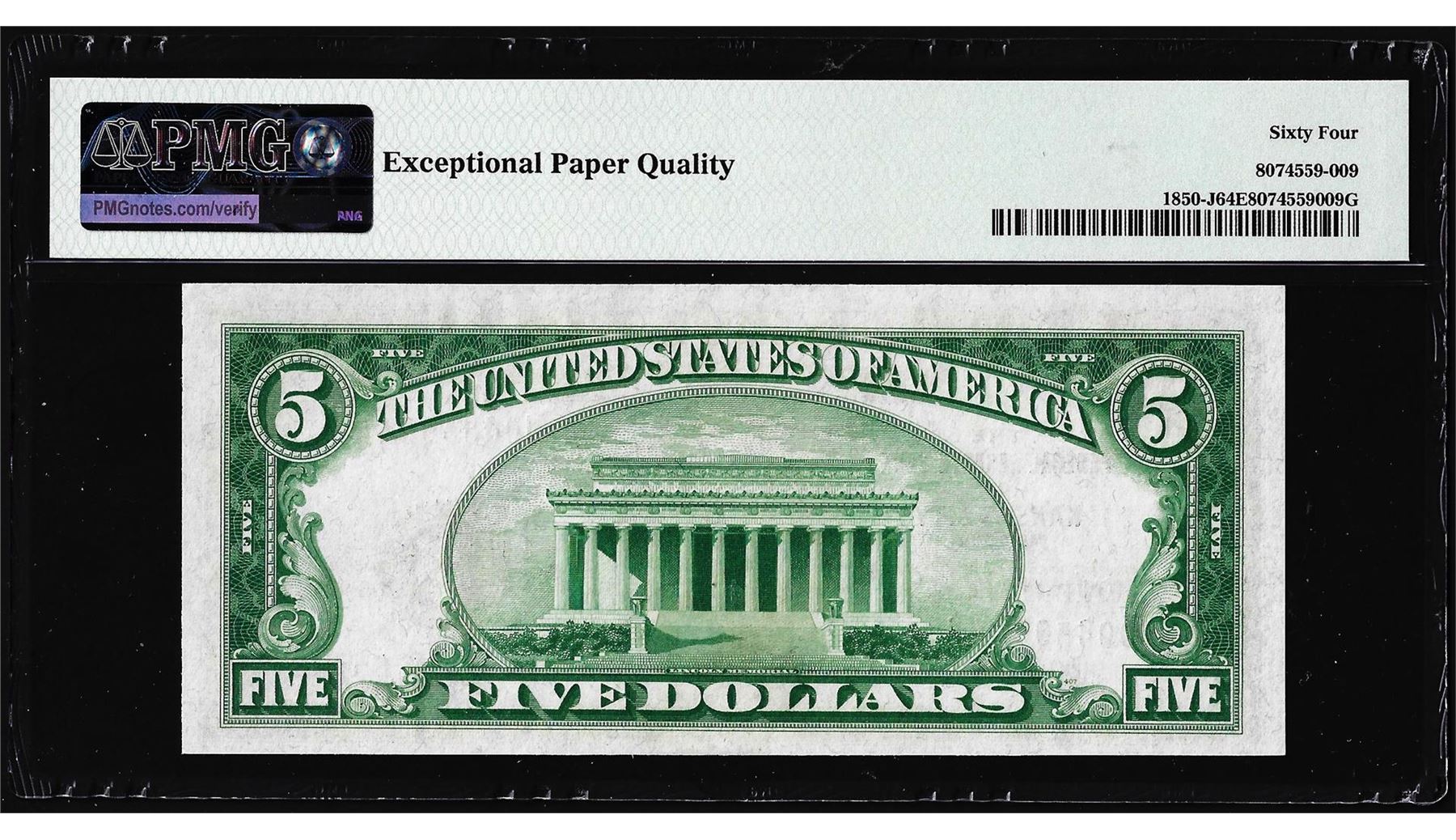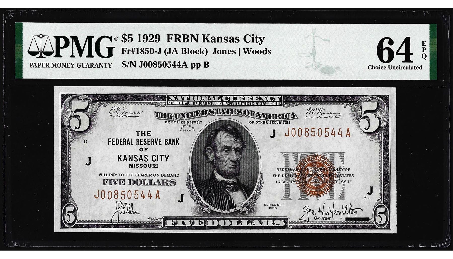One 1929 $5 Federal Reserve Bank Note Kansas City Fr.1850-J PMG Choice Uncirculated 64EPQ. PMG Certified.