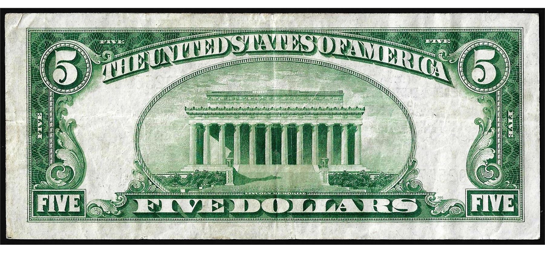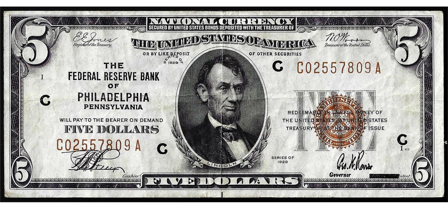 One 1929 $5 Federal Reserve Bank Note Philadelphia.