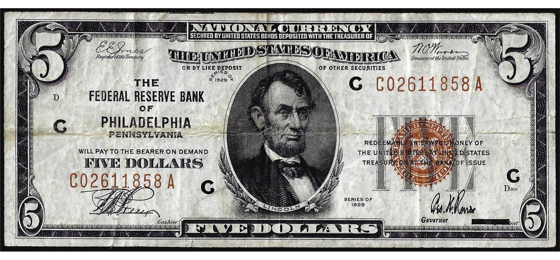 One 1929 $5 Federal Reserve Bank Note Philadelphia.
