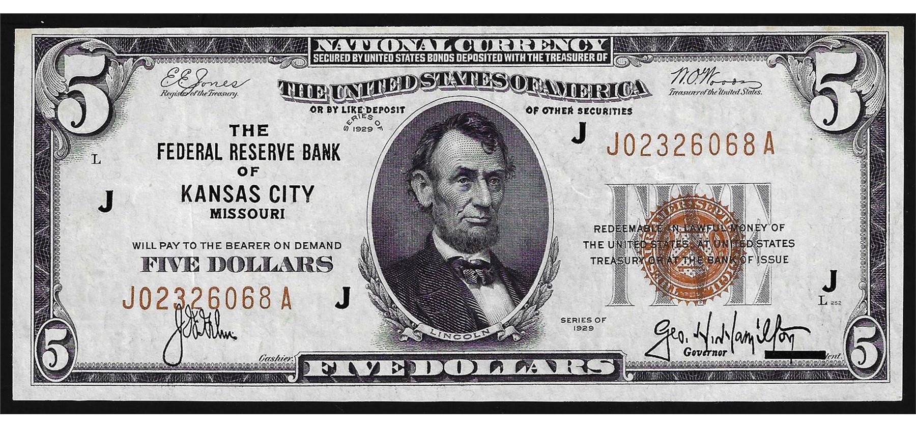 One 1929 $5 Federal Reserve Bank of Kansas City National Currency Note.