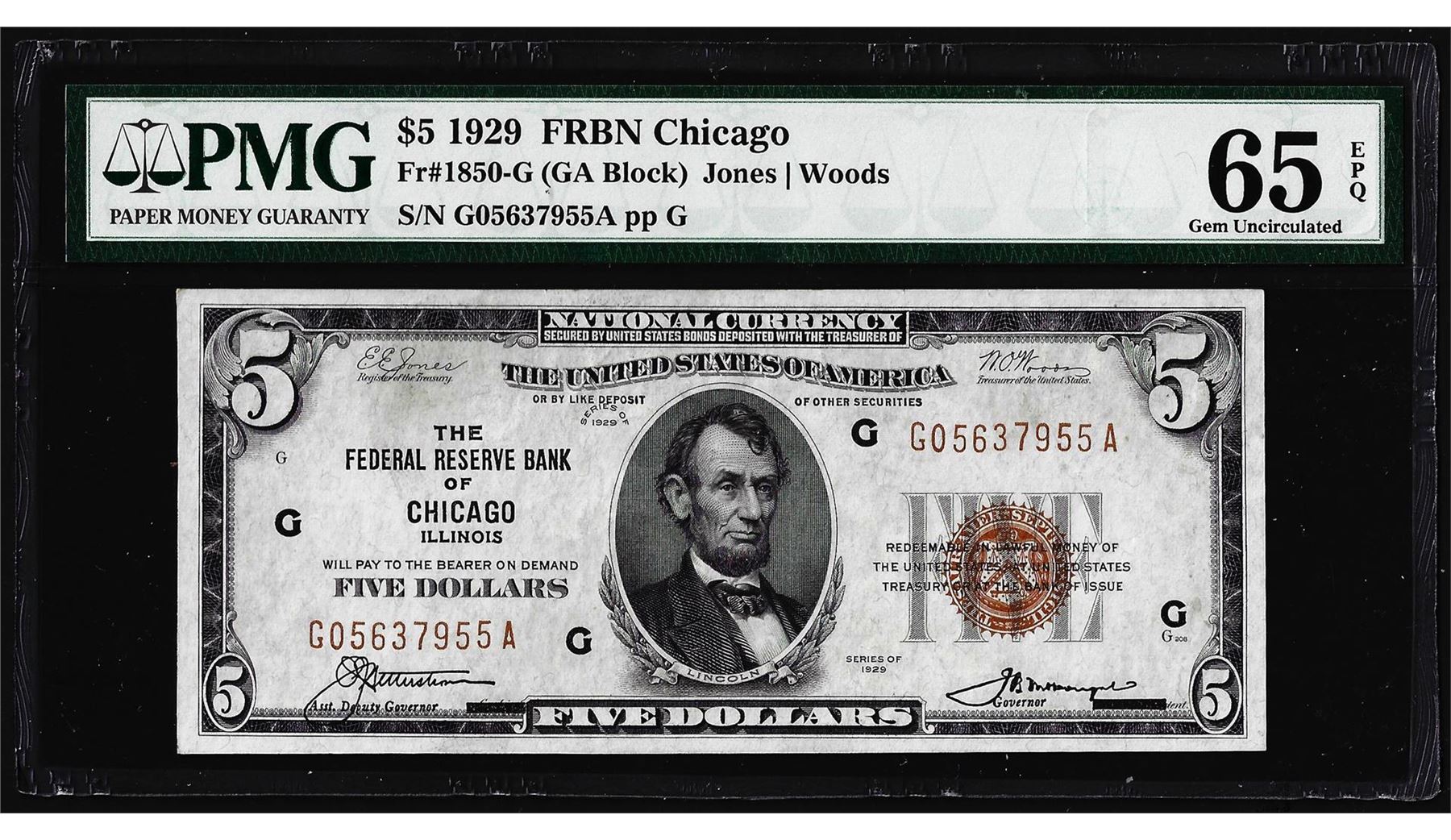 One 1929 $5 Federal Reserve Note Chicago Fr.1850-G PMG Gem Uncirculated 65EPQ. PMG Certified.