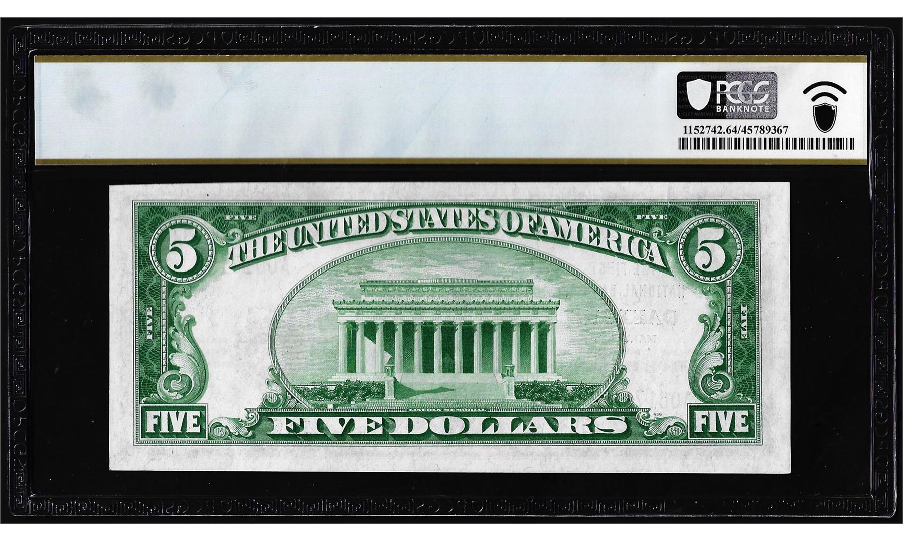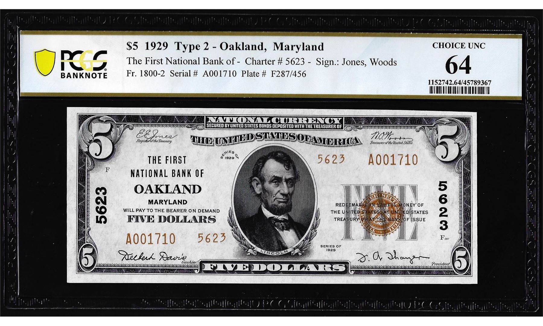 One 1929 $5 First NB of Oakland, MD CH# 5623 National Note PCGS Choice Uncirculated 64. PMG Certified.